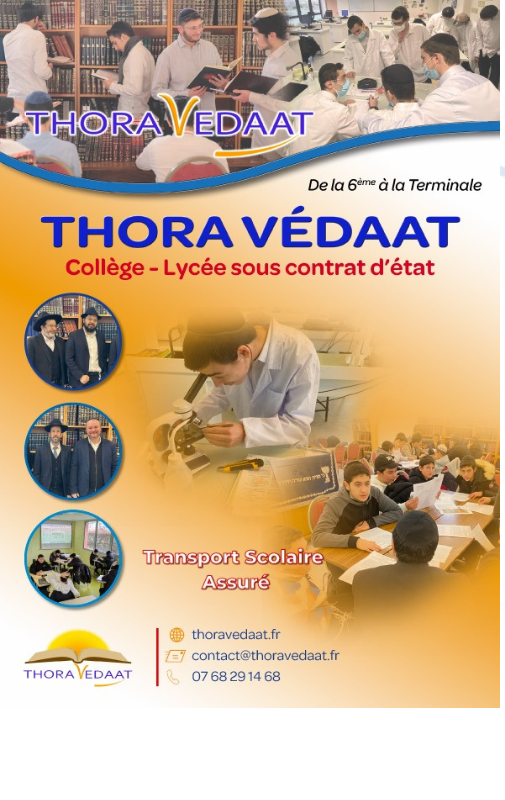 L'enseignement, l'étude ainsi que la réussite sont les bases fondamentales de Thora védaat car c'est au fil des années que nos élèves apprennent et étudient grace à nos enseignants hautement qualifiés dans un collège-lycée sous contrat d'association avec l'État, de la 6ème à la Terminale.